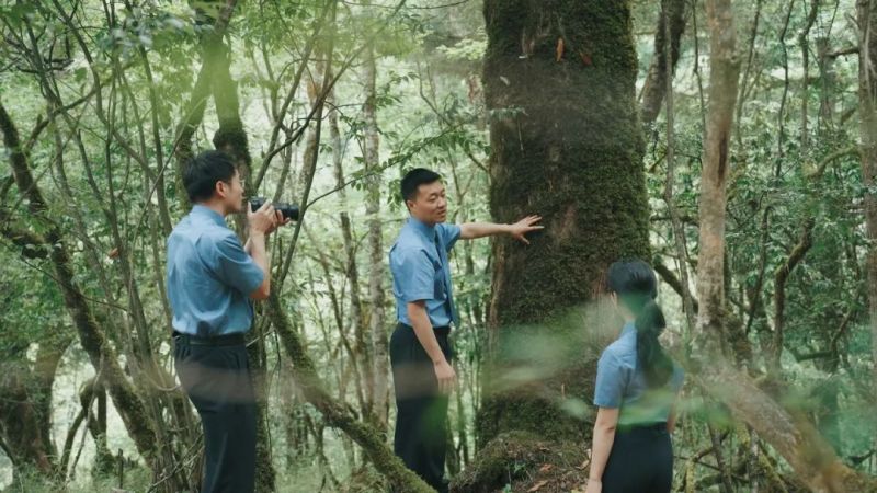 检察官深入林场调查取证,严厉打击盗伐行为,保护百年天全槭。