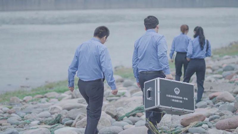 检察官携带公益诉讼勘查检测一体机,前往污水排放口进行现场取样检测。