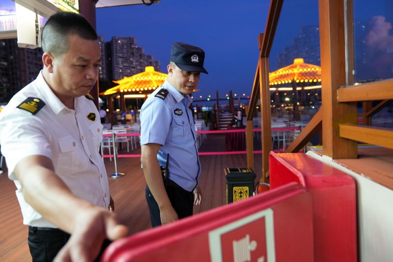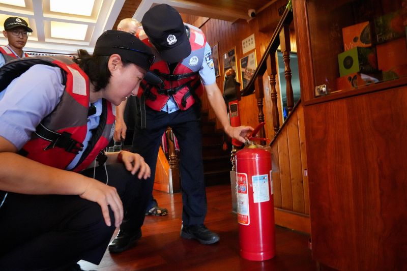今年暑期,“网红”景点太古仓码头热度攀升。新增的珠江夜游航线,加上“水上茶居”,吸引不少游客前来观光体验。警力跟着人流走,花地口派出所加大了对游船的检查力度,包括灭火器压力表指针是否正常、救生衣是否足够、船舱门是否关闭、有无管制刀具等等。为什么查得这么细?陈楷龙解释道,游船驶出码头,万一发生火灾或者事故,乘客在短时间内可能甚至无路可逃。“船上绝对不能留下任何隐患,否则一出事就是大事。”