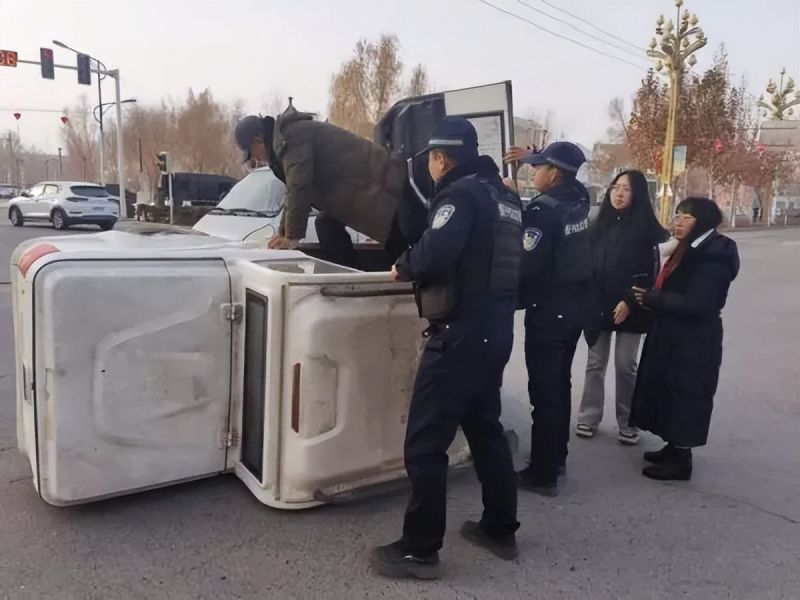 据现场目击者称,当时三轮电动车突然失控,侧翻在道路中央,车主被困车内,无法自行脱身。过往车辆和行人纷纷避让,周围一些欲帮忙的群众束手无策,现场一片混乱。正在此巡逻的荒地巴扎派出所民警迅速展开救援。
