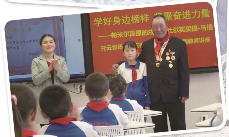老民兵护边员吐尔买买提·马提(右一)走进牧场红军小学,为学生讲述护边故事。