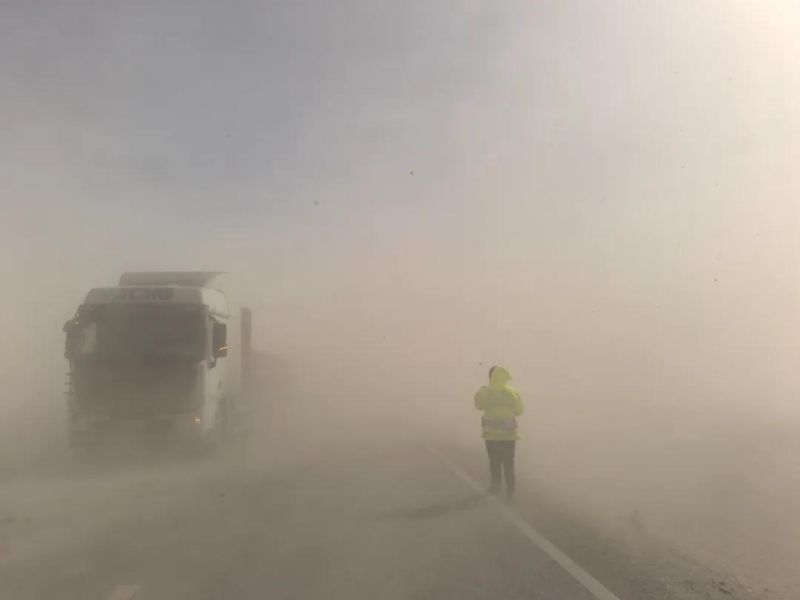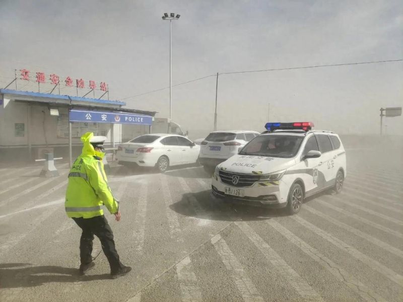 当天下午,随着风势渐弱,连续奋战6小时的民警辅警俨然化身为“移动的兵马俑”。反光背心上积满沙尘,喊话到沙哑的嗓音却仍在叮嘱过路司机:“师傅,别着急,打开雾灯跟着警车走!”