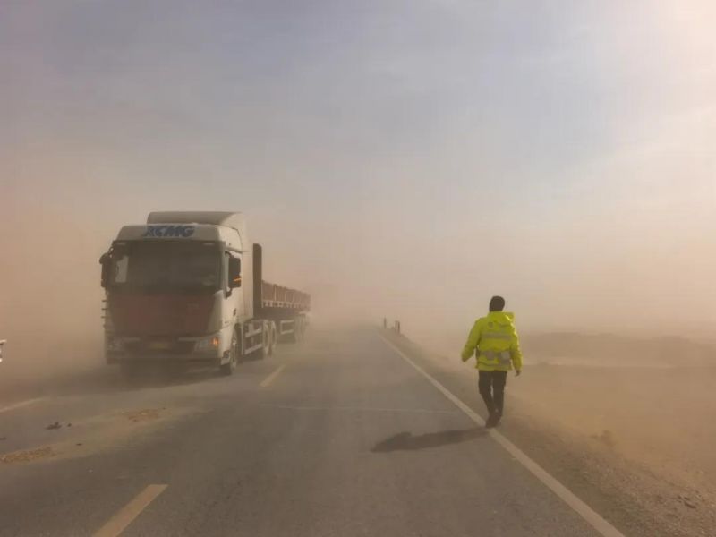 “你好师傅,沙尘天气请打开示廓灯、双闪警示灯,降低车速,保持车距、安全通行”。