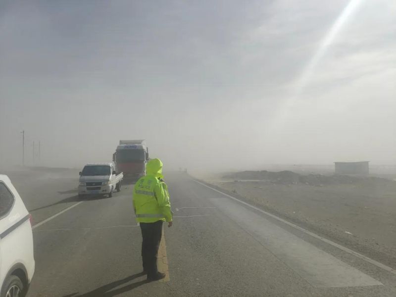在这场突如其来的强风沙天气中,223团交警中队共疏导车辆50余台次,辖区未发生一起伤亡事故。