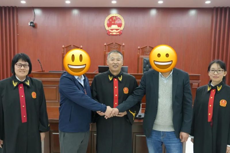 调解成功后,双方当事人喜笑颜开并与合议庭法官合影。