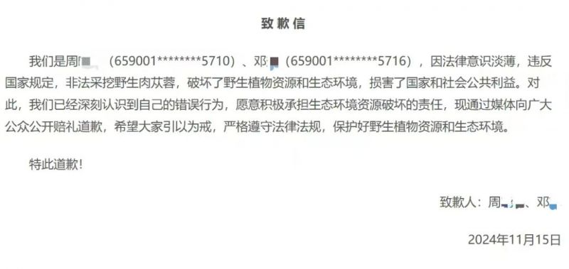 “我深刻认识到自己的错误行为,希望大家引以为戒,严格遵守法律法规,保护好野生植物资源和生态环境。”这封发布在正义网上的道歉信,字里行间满是无尽悔意。