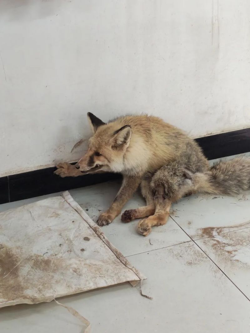 突然,一声细微的呜呜声穿透呼啸的风沙,从远处悠悠传来。张先生心头一紧,循声望去,只见百米开外一丛骆驼刺旁,有一团灰白的影子蜷缩在那儿。他快步走近查看,发现竟是一只野生狐狸。狐狸的左后腿明显骨折,无力地耷拉在一旁,身下的沙地已被刨出一个深坑,显然它在剧痛中拼命挣扎了许久,满是无助与绝望。