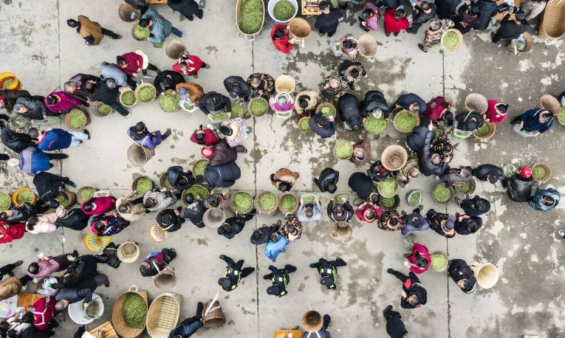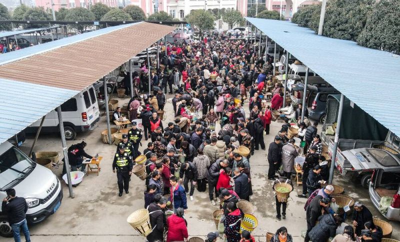 下午1点,红星镇鲜叶茶叶交易市场准时开市。收获满满的茶农们背着茶叶开始进入市场,在民警、市场管理人员和义警的指挥下,人头攒动的市场里井然有序。