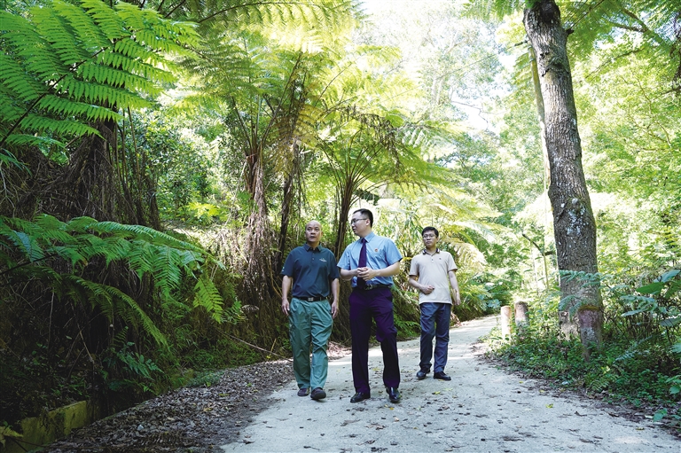 5月6日,五指山市检察院检察官卢禹霖与护林员在水满乡风门岭查看桫椤保护情况。高凌摄