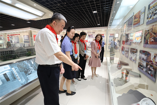全国人大代表张锦岚、刘宏艳、尚海红,全国政协委员彭静与学生们一起参观最高检检史陈列室。