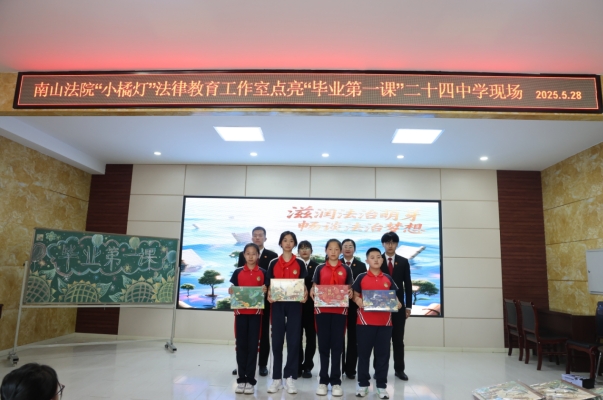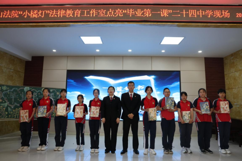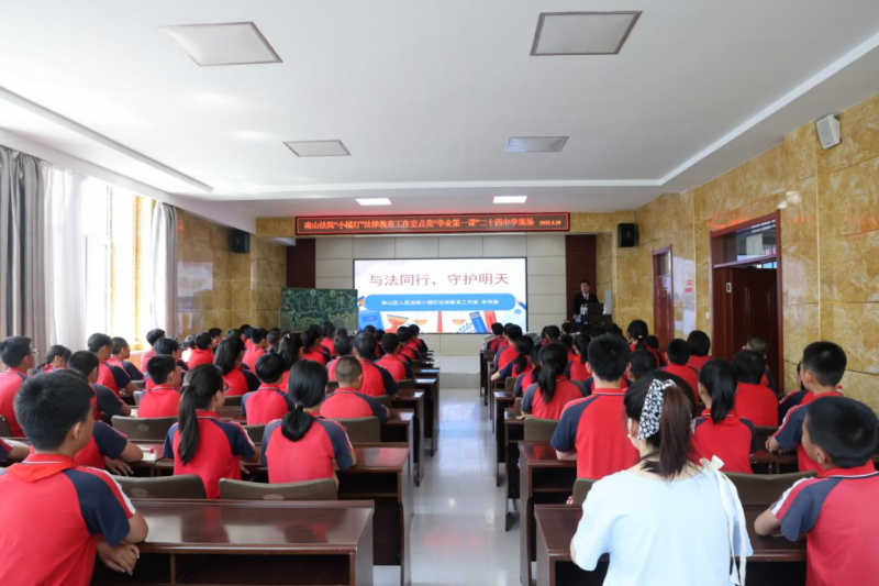 仲夏万物繁盛,梦想熠熠闪光。六月是最茂盛的季节,少年们茁壮成长,拥有最美好的模样;六月也是离别的季节,扬起生命的风帆,即将驶往梦的远方。追着风,奔赴下一程山高水长;迎着光,行至下一趟乘风破浪。又是一年毕业季,为了陪伴少年儿童欢度“六一”,也是为了给即将毕业的同学们留下一段难忘回忆,黑龙江省鹤岗市南山区人民法院“小橘灯”法律教育工作室的干警来到了鹤岗市第二十四中学,为这里的百余名小学毕业班的同学送上了一堂别开生面的主题班会“毕业第一课”,希望能用法治力量为同学们扣好人生新阶段的“第一粒扣子”。