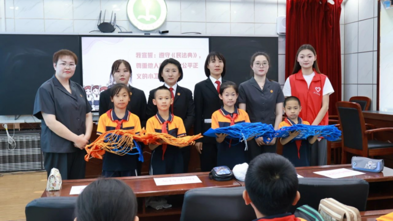 木兰县人民法院走进民主小学,开展“法治体验营·争做小卫士”主题活动。法官用通俗易懂的语言介绍法院职能,并通过模拟“抢玩具”案例,生动诠释法律如何平衡权力与责任。法袍、法槌的实物展示和试穿体验,让学生们直观感受司法庄严。活动尾声,全体学生在法官的带领下庄严宣誓:“我宣誓,遵守《中华人民共和国民法典》,尊重他人权利,做公平正义的小卫士!”稚嫩而坚定的誓言,将遵法守规的信念深植童心。