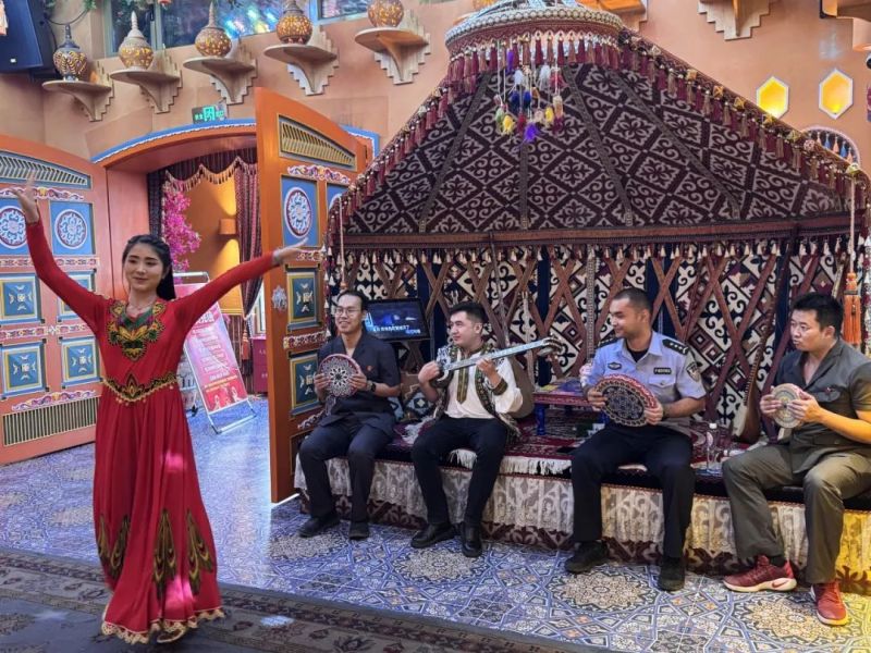 在民族特色餐厅内,“法治+民俗”互动盛宴拉开帷幕。法院干警与少数民族舞者围坐一堂,共同学习党的二十届三中全会精神要点和《民法典》实用条款等内容,通过互动问答、案例解析等形式,让法律知识“活”起来。
