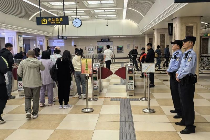 地铁作为冰城重要的交通方式,承载着众多考生的赴考之路。当阳光洒满清晨的街道,地铁站里早已看到藏蓝卫士的身影。高考期间,哈尔滨地铁1号线、2号线、3号线串联起15个考点,公交分局民警化身为“地下护航人”,在站台、闸机口、换乘通道织就安全网。在省政府地铁站,这个连接哈九中考点的重要枢纽,民警王若翔和巡组同事提前两小时到岗,手持扩音器引导考生:“携带准考证的同学请走左侧绿色通道!”