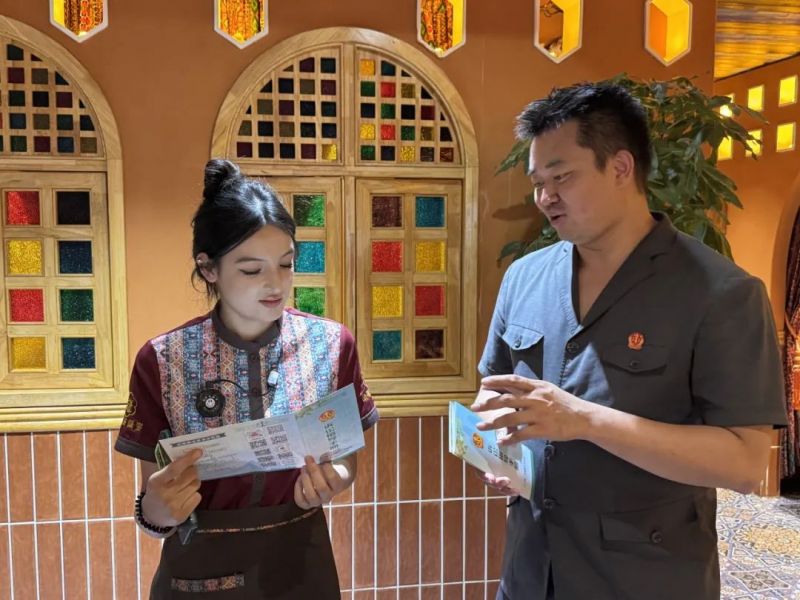 在民族特色餐厅内,“法治+民俗”互动盛宴拉开帷幕。法院干警与少数民族舞者围坐一堂,共同学习党的二十届三中全会精神要点和《民法典》实用条款等内容,通过互动问答、案例解析等形式,让法律知识“活”起来。