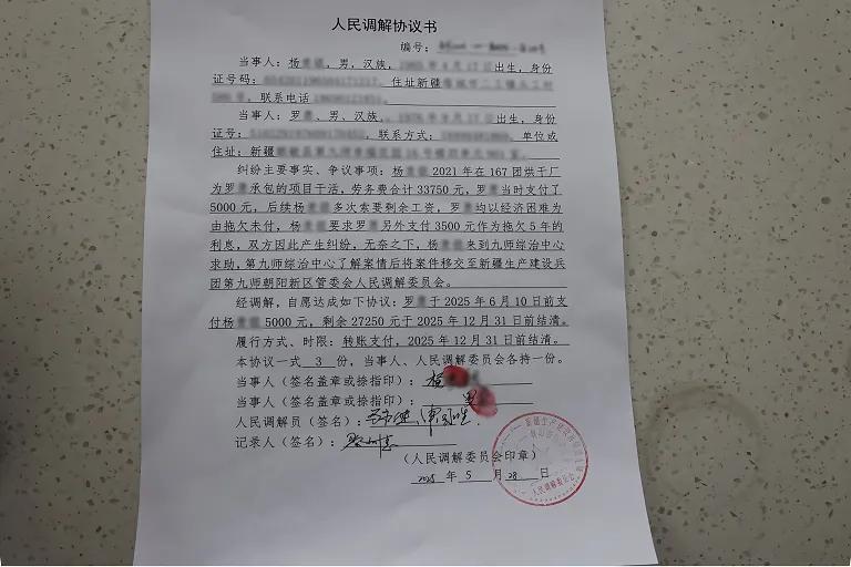 经过多轮协商,双方最终达成一致调解协议:罗某同意支付杨某全部劳务报酬28750元,并额外给付3500元作为拖欠五年的利息补偿,承诺于6月10日前先行支付5000元,剩余27250元于2025年底前结清。