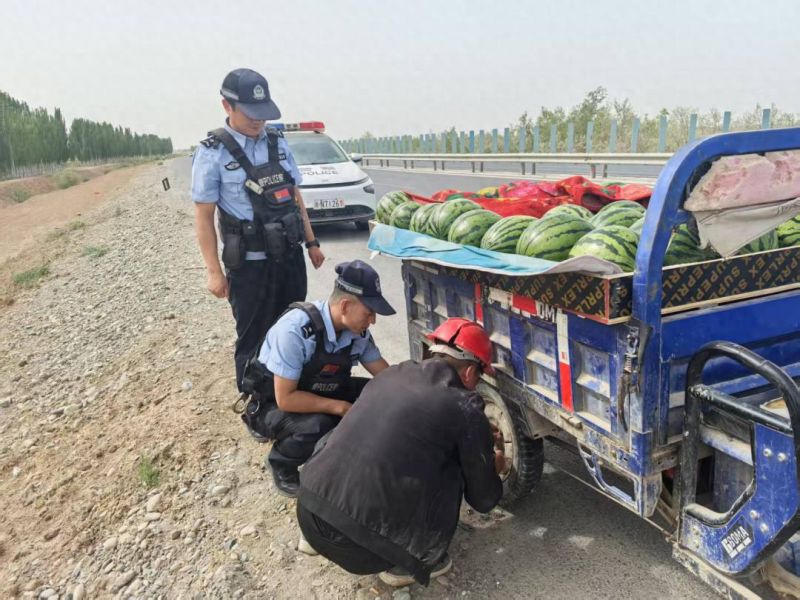 6月1日正午,烈日炎炎。双城派出所巡逻组在六团路口发现一辆满载西瓜的三轮车爆胎。车主张大哥(化名)急得满头大汗:“警察同志,我这瓜还赶着卖午市呢!”