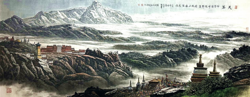 《天界》是一幅长360cm,宽145cm的鸿篇巨制,也是一幅势壮雄强的诗意图。展开作品,映入眼帘的是,峰峦连绵,势壮雄浑;云烟浩渺,吞吐八荒;岫岭巨壑,叠嶂露华;桂殿兰宫,雕镂玉砌……,峰峦、云烟、岫岭、宫殿,旷其盈视,天、云、山、树,上下苍茫,纡其骇瞩。画面有工、有写,工而精微,写而酣畅,一切具象之物皆物态欣豫,一切意象之美,又神妙如动。虚与实、远与近,万里山川尽其妙,千里云烟出其势。高远之势突兀、平远之意缥缈、深远之境重晦。独具匠心地运用传统“三远法”构图,高不见顶,深不见底,以咫尺之图写千里之景,最大限度地扩展了画面的容量和空间,远观不离座外,近视又有千里之远,笔端仿佛拢了天地之精华,聚了山川之灵气。可观、可览、可游,既给人一种“会当凌绝顶”的视觉体验,又给人一种妙不可言的诗情意境。