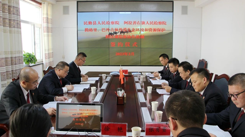 民勤县检察院与阿拉善右旗检察院探索建立跨区域检察协作机制,共同签署《关于建立腾格里和巴丹吉林沙漠跨区域生态环境和资源保护检察协作机制的意见》,共清理游牧羊只600余只,骆驼70余峰,向阿拉善右旗检察院移送公益诉讼案件线索1条,毗邻地段禁牧区内防护网破坏、公益林内放牧等违法问题得到有效整治,辖区禁牧封育取得实质性成果。下一步,民勤县检察院还将与内蒙古左旗、右旗及甘肃凉州、古浪、金川区三地检察机关会签《跨区域荒漠化治理检察协作机制》,明确建立“线索互移、案件联办、生态共护”工作模式,就案件管辖、取证标准、生态修复标准达成一致,在接下来的治沙季,六地将联合组织“检察公益林”植树活动,打造跨区域生态治理示范带。