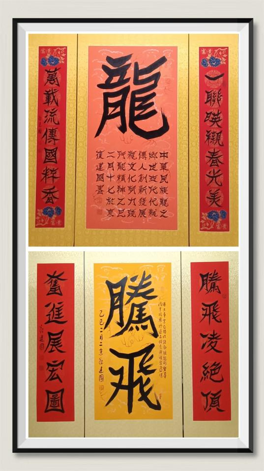 上:中堂《龙》68cmx136cm 对联《一联映衬春光美 万载流传国粹香》22cmx136cm