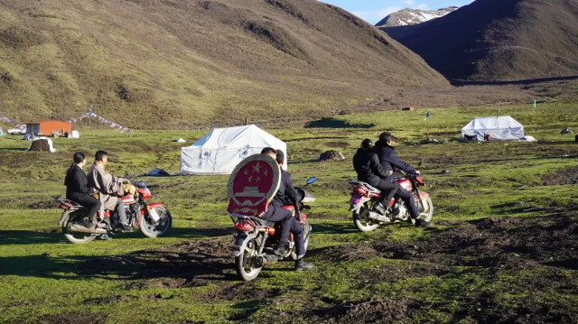 近日,队员们骑着摩托车远征高原,翻越海拔5000米的高山,沿着蜿蜒溪流,深入亚丁乡呷曲通牧区,将法治与平安的种子播撒在牧民心中。