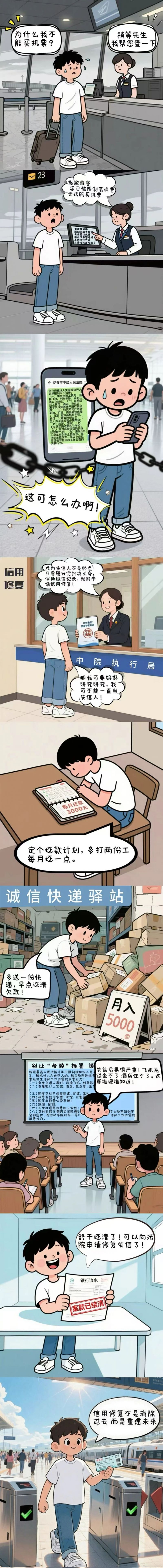 当“失信”遇到“修复”,人生按下 “信用重启键”! 2025-06-19 22:03 龙江政法网 字号: 被限制高消费后,连孩子上私立学校都受影响…… 企业上了“黑名单”,谈合作时总被“另眼相看”…… 这些因失信陷入困境的场景 是否让你悔不当初? 别慌! 信用不是“一次性消耗品” 当“失信阴霾”笼罩时 法院也为你留了一扇“修复之门” 黑龙江省伊春市中级人民法院 用一组漫画带你看懂 信用修复那些事儿 责任编辑:CmsTop 打印