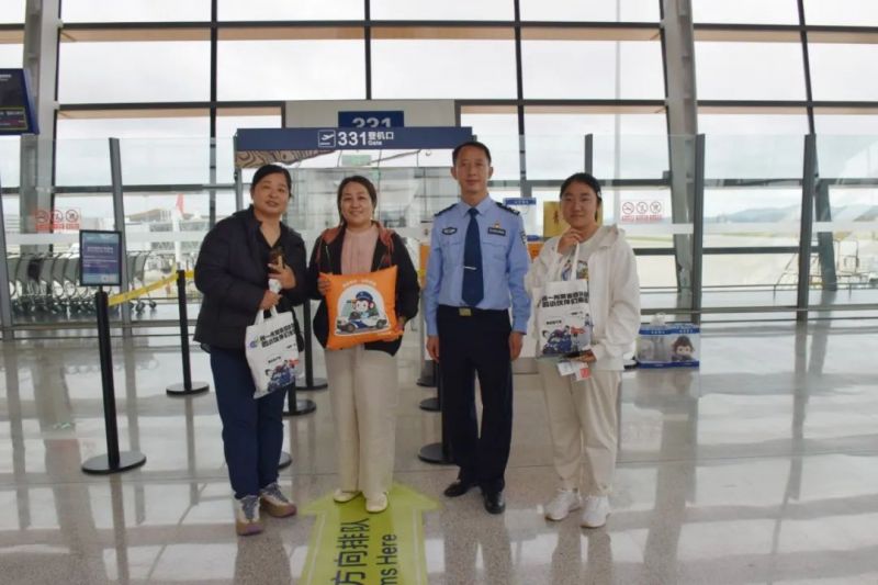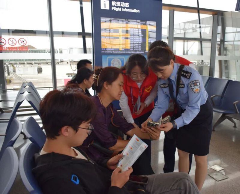 昆明长水机场候机厅331号登机口前人声鼎沸,热闹非凡。原来是云南省第一强制隔离戒毒所“如一”禁毒普法宣讲团的警察和四川航空云南分公司的志愿者们,正与候机旅客积极互动,开展禁毒知识宣传活动。