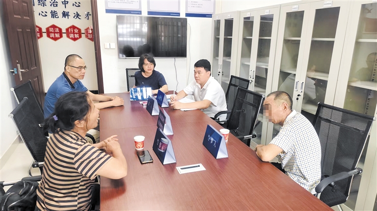 白沙综治中心常驻法官、司法局常驻干警和中心工作人员调解一起涉土地纠纷。(白沙综治中心供图)