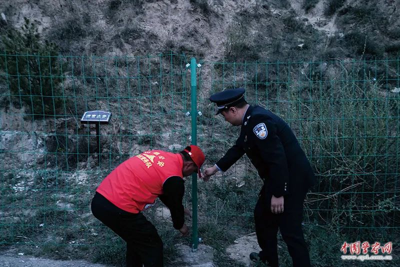 山阴县公安局广武派出所民警和长城保护员检查长城沿线铁栅栏。