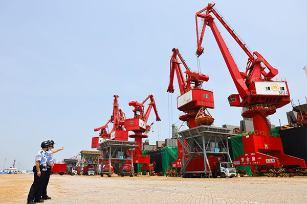 漳州边检站采取“24小时视频监控+高频次现场巡逻检查”的方式强化口岸管控,巡逻民警对进出码头车辆、人员、货物等情况进行临检,实时掌握船舶的靠泊与生产作业情况,助力口岸安全生产。