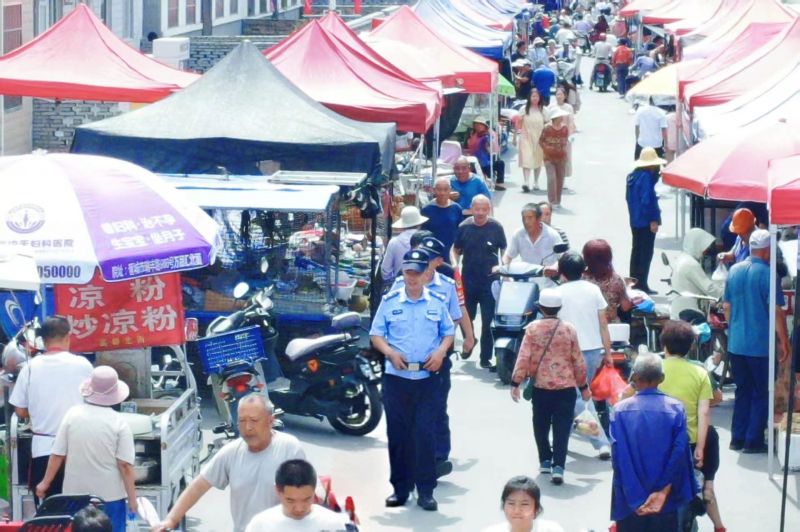 “走过路过不要错过……”熙熙攘攘的人群随着此起彼伏的叫卖声,涌向各个摊位。每逢农历初八、十八、二十八是山西省晋城市泽州县高都镇传统赶集的日子,集市上摊位密布、人流如织。高都派出所优化“集市警务”运行模式,通过开展巡逻防范、隐患排查、空中巡查和安全宣传等工作,让集市“见警察、见警车、见警灯”成为常态,全力守护古镇“烟火气”。