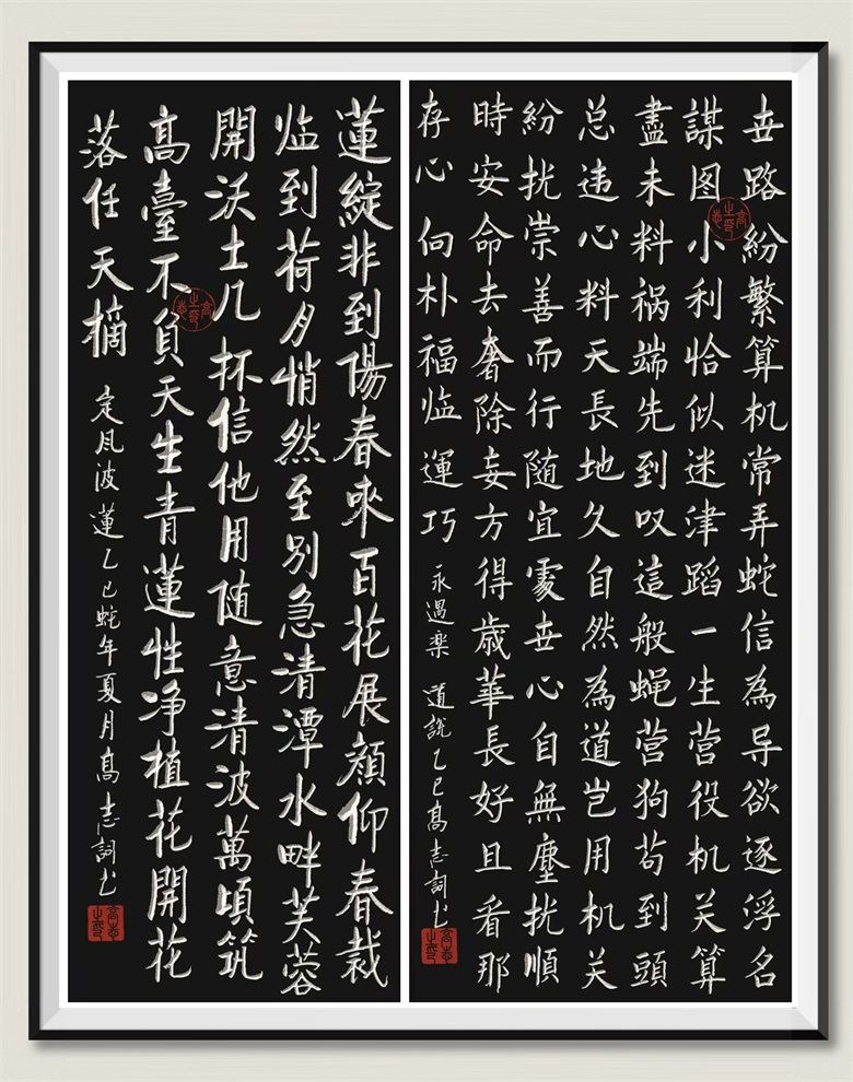 他自幼痴迷书法,每日勤练不辍,既研习王羲之、颜真卿等古代大家的经典,也汲取现代书法创新理念。其作品笔画精雕、结构严谨,兼具宫廷书法的庄重典雅与山泉般的灵动生机,笔势磅礴如龙蛇游走,尽显艺术张力。
