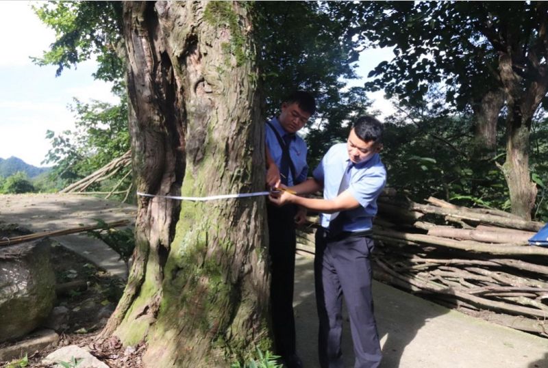 7月,印江自治县人民检察院检察官深入该区域实地走访,烈日下与村支书穿梭林间,详细排查红豆杉分布、管护及历史保护情况,并向林业专家了解到“土壤湿度、光照条件、人为干扰”是其生存关键因素。调查发现,当地红豆杉存在未挂牌保护、部分树干中空遭硬化道路挤压、根系裸露面临枯死风险等问题。