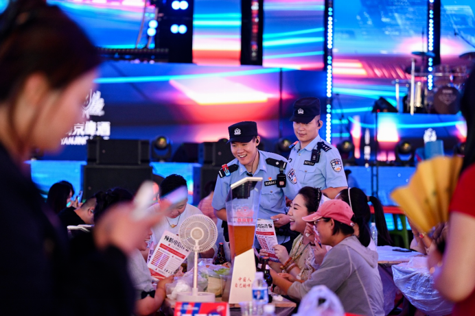 “遇事别冲动,有事好商量。”“打架没有赢家,平安才是福气!”“拒绝酒驾、远离赌博”“防盗防诈防溺水、平平安安过一夏……”在执勤过程中,民辅警深入场地、走近餐桌,通过发放宣传资料、面对面讲解等形式,向游客普及交通安全、防范诈骗、预防溺水等安全知识。警方还精心设计制作了印有“酒后不开车,开车不喝酒”“举杯畅饮啤酒,归途勿忘安全”等醒目提示语的立式展架,放置在园区美食街啤酒花园、梦幻冰雪馆、四季游乐园等重要区域。同时,充分利用园区及啤酒大棚的电子屏幕,循环播放安全提示宣传片,引导游客自觉遵法、守法,倡导文明旅游、安全旅游新风尚。