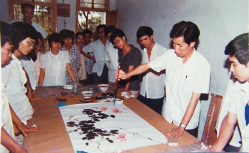上图:林丰俗(右二)在怀集工作期间,向美术爱好者传授国画创作技巧(方权裕摄)。