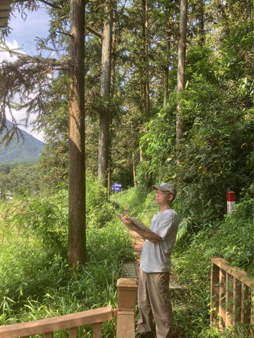 上图:肇庆市美术家协会顾问温绿巍在岳山写生
