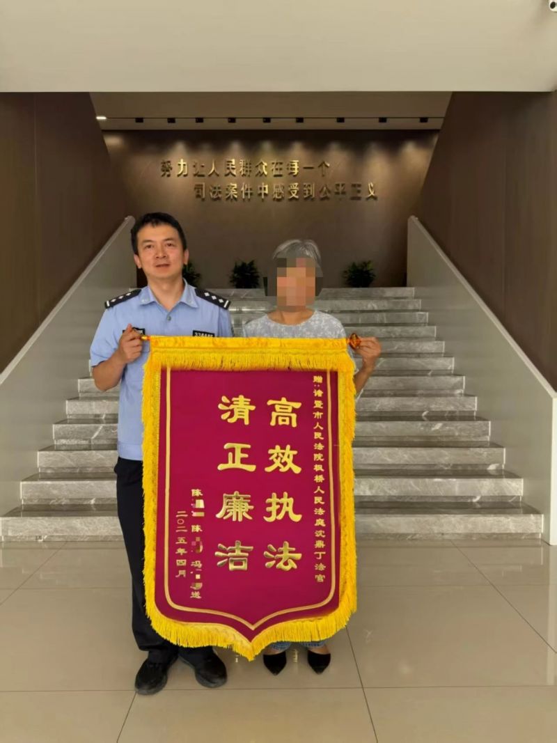 2025年4月,陈家三兄妹捧着一面绣有“高效执法清正廉洁”的锦旗走进法庭,交到了枫桥法庭执行员沈鼎丁手中。