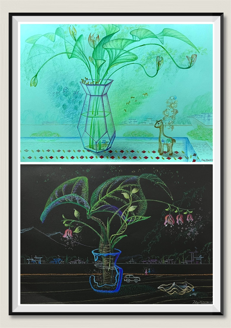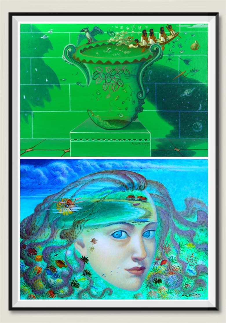 有人说“艺术就是未来的科学,而未来的科学却没有艺术的想象空间”。《变幻的空间》唤醒了笔者对这句话的理解。是的,科学是艺术想象的实现,实现却没有想象的丰富,如登月球,缺少了嫦娥奔月诗意的艺术性,如探深海,失去了哪吒闹海艺术性的韵味。(诸如艺术化的科学,科学化的艺术,在此不做展开)。笔者想说的是,此幅作品,胡新凭借着丰富的想象,把一切想象都植入“大脑”之中,以“大脑”的容量容纳一切物象,而一切物象又通过艺术化的处理,在科学化的严谨之中,或略带夸张之法,或以穷尽毫厘的细节处理,展开、延伸,表现出“有意味的形式”,成为无限放大的艺术空间。