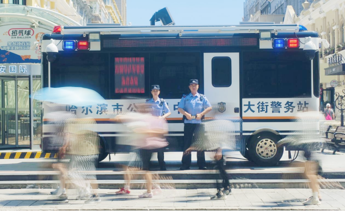 中央大街作为城市名片,夏季客流密集,主街与周边路网交织,既需防拥堵,也需护秩序。道里公安分局灵活调配巡逻警力,采用“两人一组、立巡结合”的勤务模式:步巡警力穿梭主街,重点守护老字号商铺、网红打卡点等核心区域,第一时间化解游客纠纷、疏导密集人流;交管部门同步推行“弹性管控”,日间在沿街设临时上下客区,民警现场引导车辆即停即走,避免占道拥堵;傍晚依客流调整管控范围,延长步行街开放时间,让游客既能安心漫步,又能便捷出行。