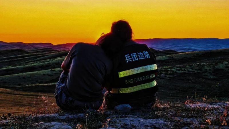 落日熔金,霞染边关。逆光中,排长的短袖与“兵团边防”反光背心相倚,两道身影在苍茫大地拉长成大写的人字。无需言语,沙尘浸透的衣襟、相靠的肩背,已诉尽“岂曰无衣?与子同袍”的战友情深。这帧剪影,是日复一日的坚守,是军民同心筑起的血肉长城,在万里边关刻下最温暖的印记。