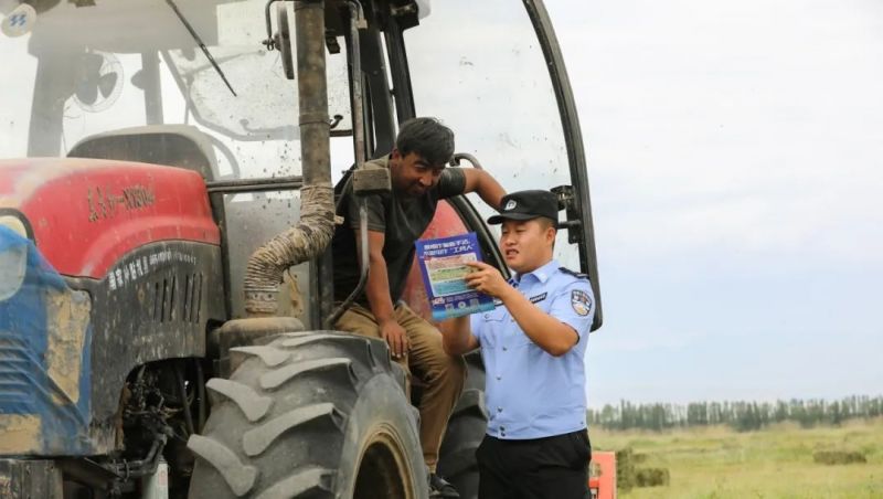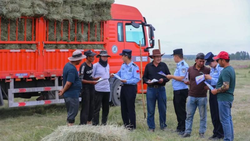 7月27日下午,第四师昭苏垦区公安局刑事侦查大队联合洪土沟边境派出所组建的“反诈小分队”,驾驶着警车穿梭在颠簸的牧道上,车斗里除了汉哈双语反诈宣传单,还整齐地摆放着镰刀、绳索——他们此番前来,既要帮助牧民抢收牧草,更要把防诈知识送到这片繁忙的草场上。