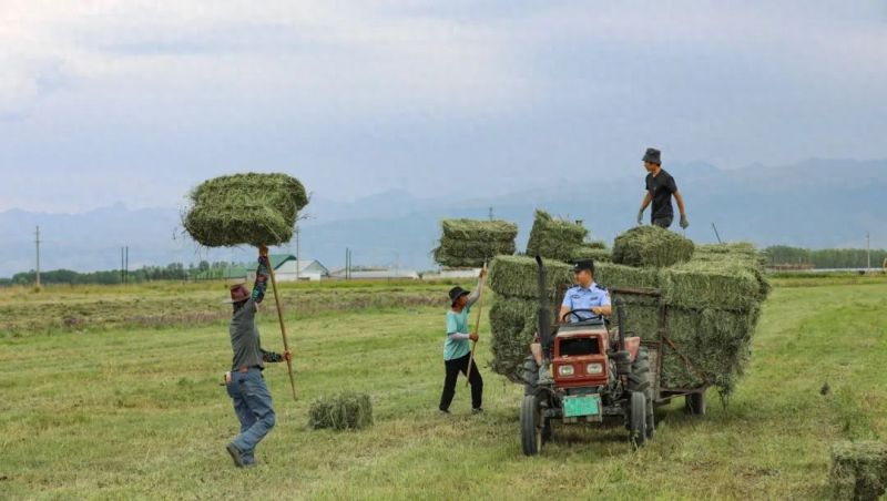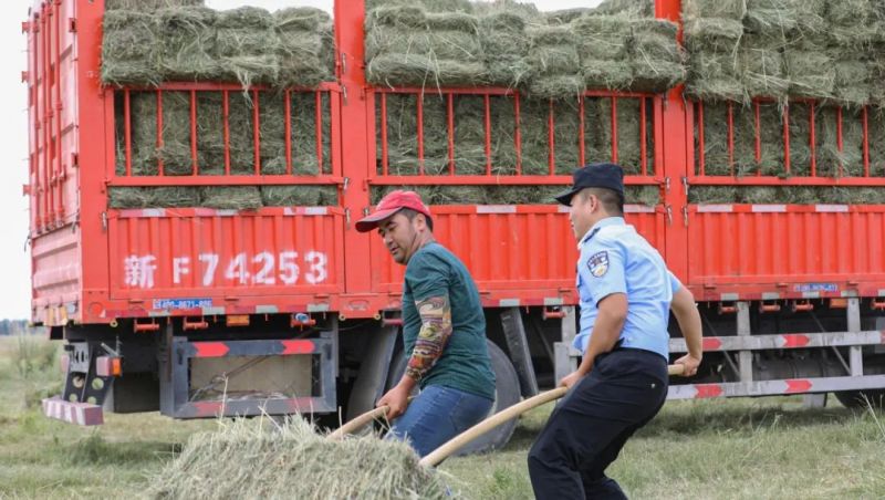 “大哥,这捆草我来扛!”刚到草场,民辅警迅速抹了把额头滚落的汗珠,毫不犹豫地接过牧民手中的草叉。