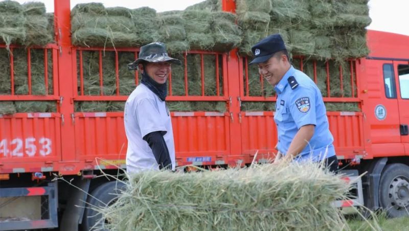 队员们的警服很快被汗水浸透成深色,与牧民们的工装在草堆旁交替闪现,割草机的轰鸣声中,不时夹杂着大家欢快的笑声。