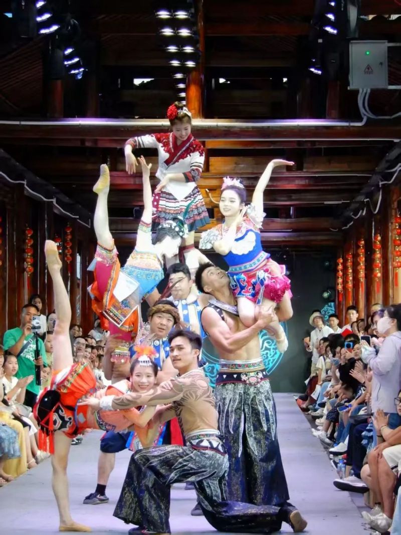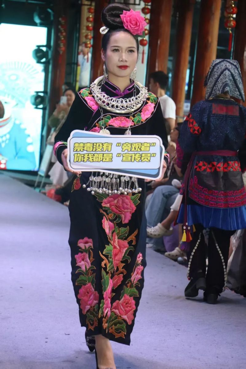 活动现场,当地妇女、青少年、志愿者和民间艺人化身禁毒宣传模特,身着各自传统的少数民族服饰,手举禁毒非遗作品,踏着铿锵有力的鼓点与悠扬的婉转旋律,自信从容地行走在充满乡土气息的“村T”舞台上。