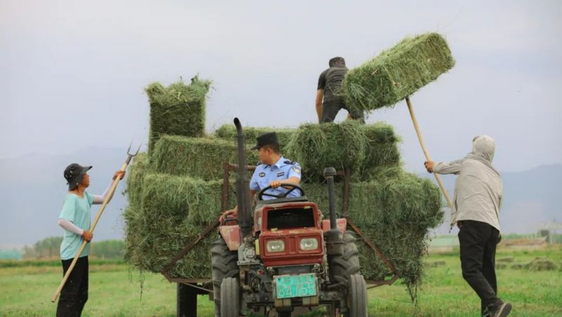“大哥,这捆草我来扛!”刚到草场,民辅警迅速抹了把额头滚落的汗珠,毫不犹豫地接过牧民手中的草叉。