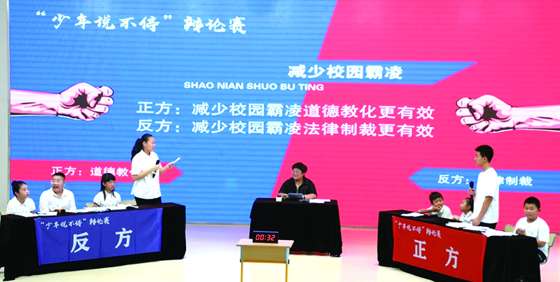 报告厅内,来自全市5所学校的8名辩手组成正反两方,一场围绕着“减少校园霸凌,法律制裁更有效还是道德教化更有效”的辩论赛精彩上演。