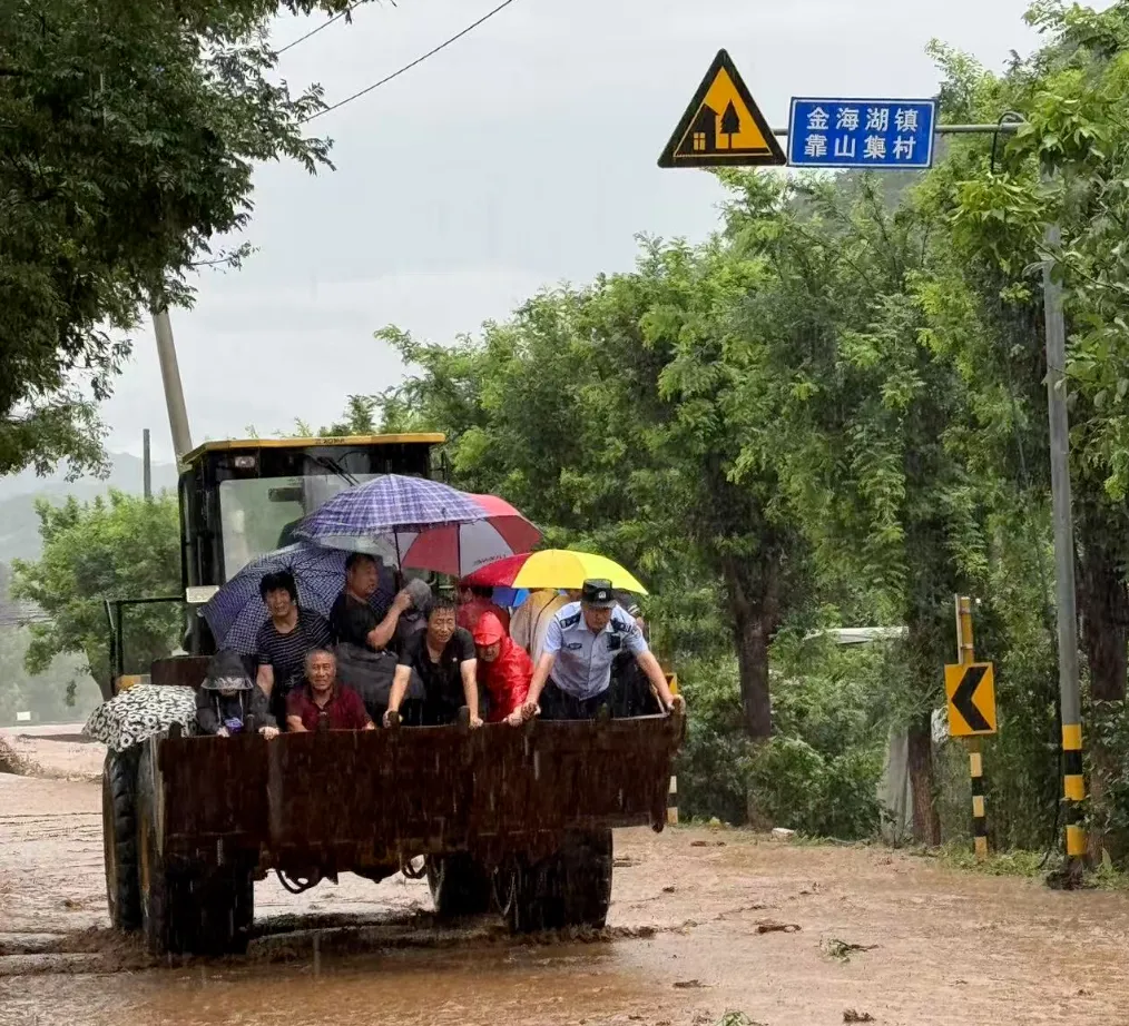 平谷分局金海湖派出所所长张继平与民警和村民一道,利用挖掘机转运受困群众。