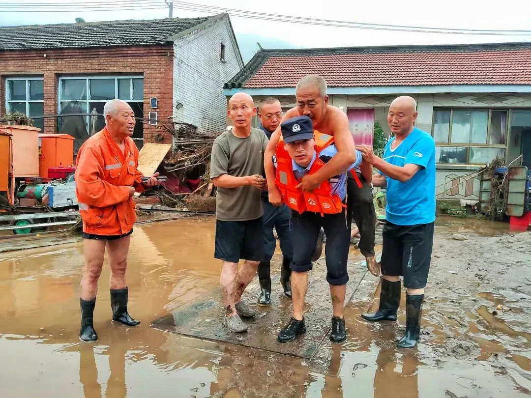 延庆分局四海派出所民警在延庆区珍珠泉乡下水沟村帮助转移受困群众。