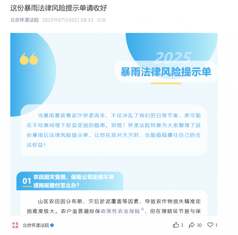 “赵书记,这篇文章太有用了,我家果园被冲毁了,我正愁怎么向保险公司索赔呢。”高岭镇的一位果农看到文章后,按照里面提到的流程,及时收集证据,联系保险公司。“同志,我家车被淹了,我按照文章里的指引报案了,保险公司说能赔。”一位车主也激动地说道。村民们说:“你们的宣传太有用了,让我减少损失的同时,也让我学到了法律知识,以后遇到类似问题就知道怎么处理了!”怀柔法院立案庭(诉讼服务中心)发布《暴雨法律风险提示单》。这个提示单中既有农田保险理赔、服务合同履行,还有车辆涉水损坏理赔、公共安全保障责任。每个单元下面还详细了列明了应对的方法和注意事项。
