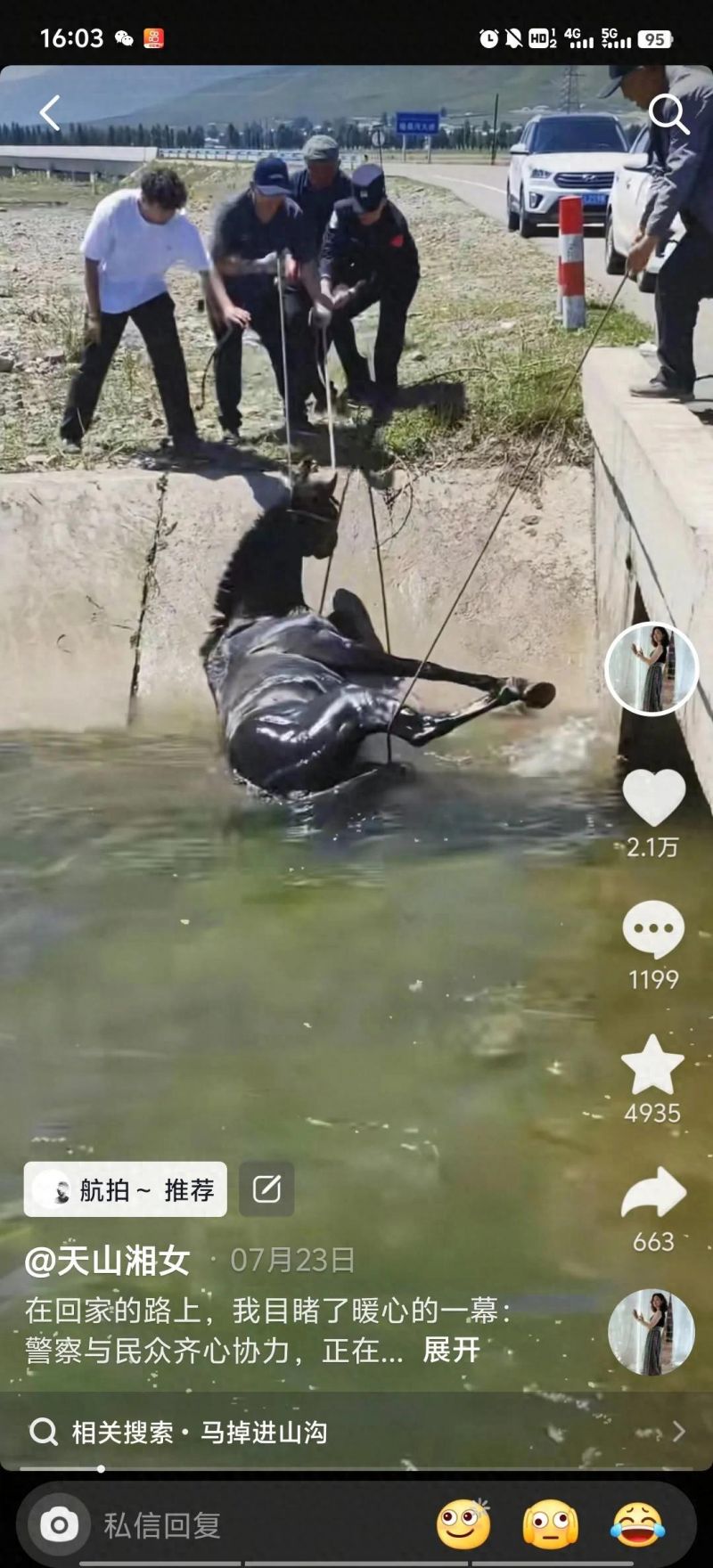330万次播放、2.1万次点赞,近日,一段记录新疆生产建设兵团第四师昭苏垦区警民携手救助渠道落水马的视频在社交媒体持续升温。第四师七十七团群众石女士在行车途中偶然拍下的救援画面,不仅定格了危急时刻的温情瞬间,更成为展现边疆警民鱼水情深的生动注脚。